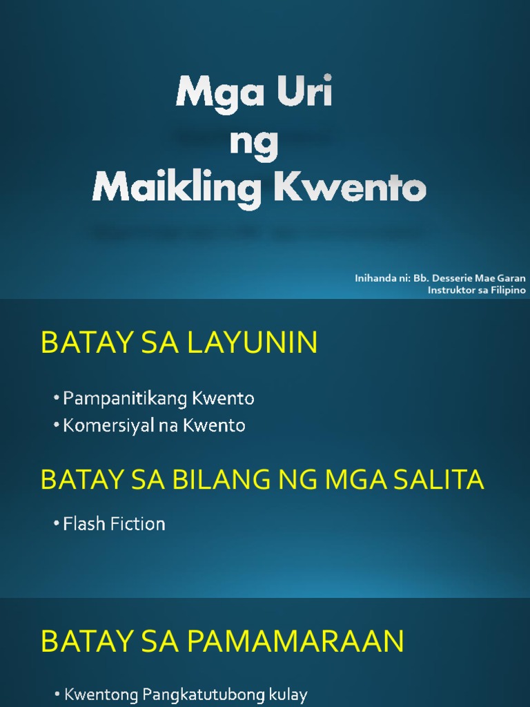 Mga Elemento ng Maikling Kwento. Lumaki si Baste sa puder ng kanyang tito. Iba Pang Uri ng Maikling Kuwento Kuwento ng Pag-ibig Kuwento ng Katutubong Kulay Kuwento ng Katatakutan Kuwento ng Kababalaghan Kuwento ng Katatawanan.