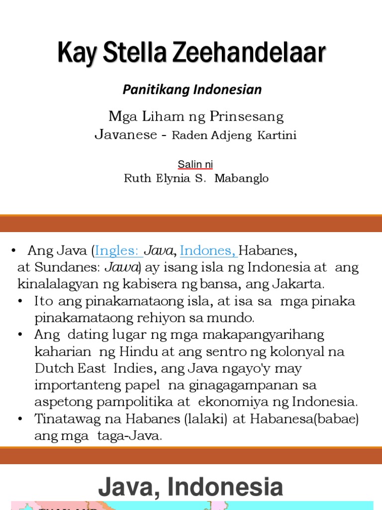 Kay Estella Zeehandelar Panitikang Indonesian Mula sa mga liham ng isang Prinsesang Javanese Salin ni Ruth Elynia S. Mabanglo ay tumutukoy sa mga kababaihang ibinibinta ang kanilang sariling katawan upang mabigyan ng sapat na pamumuhay ang kanilang pamilya. Mirakawaii Sanaysay - kay sitti nurhaliza.