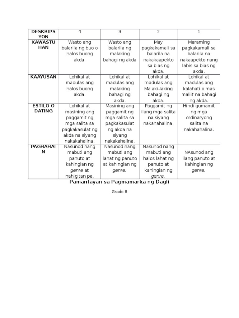 Save Save Rubrik Sa Pagtataya Ng Talata For Later. Madalas rin pinapasulat tayo nito kaya inaalam talaga nating kung paano gumawa ng maikling kwento. Gagamit din ang estudyante ng rubric sa paggawa ng video presentation para mas maging.