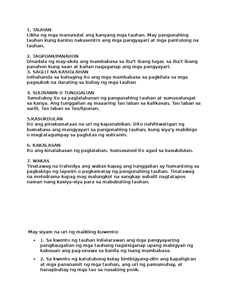 Elemento ng Maikling Kwento. Napatutunayang ang mga pangyayari ato transpormasyong nagaganap sa tauhan. Ito ang Tao Laban Sa Tao Tao laban sa sarili Tao laban sa lipunan at tao laban sa kapaligiran o kalikasan.