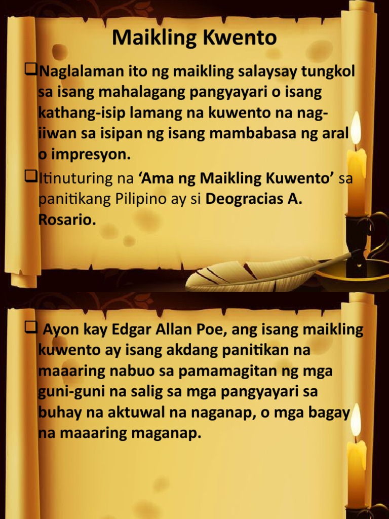 Ito ay maaring likhang isip lamang o batay sa sariling karanasan na nag-iiwan ng isang kakintalan sa isipan ng bumabasa onakikinig. MAIKLING KWENTO Inihanda ni. Mga kalamidad katulad ng lindol sunog at baha ang kalaban ng tao na kadalasan ay pinagbubuwisan ng buhay.
