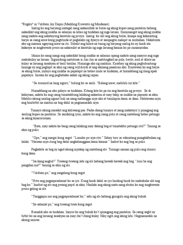 Regalo by valdwin jay dapin maikling kwento. Alam ng butihing ina na ang bagay na ito ay mahalaga sa anak dahil mahal nito ang kanyang guro. Regalo ni Valdwin Jay Dapin Maikling Kuwento ng Mindanao Inalog ko ang baryang matagal nang nakaimbak sa bulsa ng aking kupas nang pantalon habang nakadikit ang aking mukha sa salamin sa labas ng tindahan ng mga laruan. Henry Isinalin ni Rifino Alejandro Malapit na ang pasko at nag-iisip si Delia ng magandang pang regalo sa kanyang si Jim nais niyang ibigay ang isang pambihirang regalo pambihira at yari sa pilak.